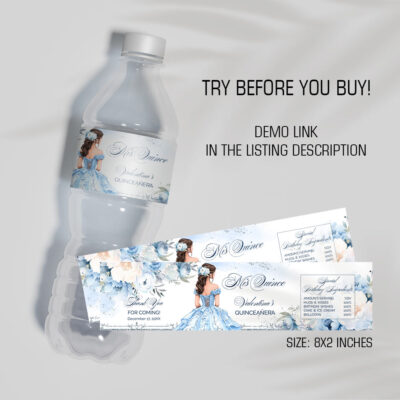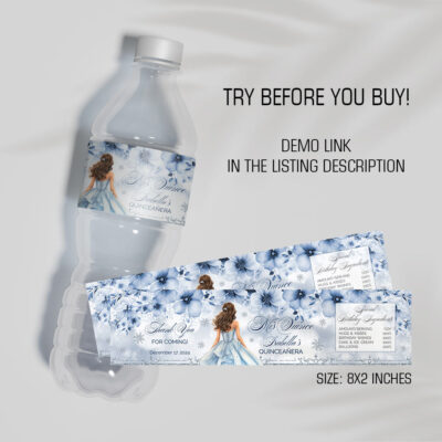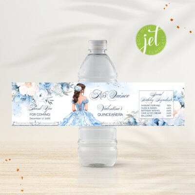 - Blue Quinceañera Water Bottle Labels will add an elegant Cinderella touch to your Sweet 15 celebration. These printable labels are easy to use and perfect for decorating drinks at your quinceañera. Try Demo, Copy and Paste into browser. https://jettemplate.com/demo/MX6463 This is a Digital Item that you'll be able to access…