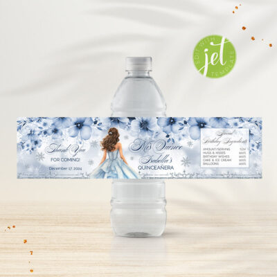 - Winter Quinceañera Water Bottle Labels will add an elegant Cinderella touch to your Sweet 15 celebration. These printable snowflake water bottle wrappers are easy to use and perfect for decorating drinks at your quinceañera. Try Demo, Copy and Paste into browser. https://jettemplate.com/demo/MX6463 This is a Digital Item that you'll be…