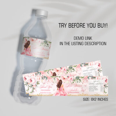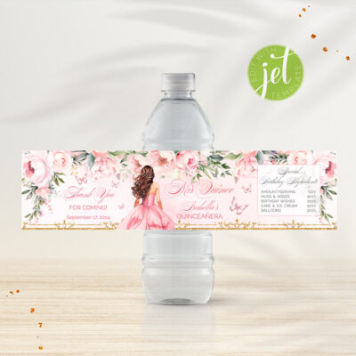 - Pink Quinceañera water bottle labels with flowers, butterflies, and a gold crown is perfect for a Sweet 16 or Mis Quince Años celebration. Try Demo, Copy and Paste into browser. https://jettemplate.com/demo/NI3230 This is a Digital Item that you'll be able to access and EDIT yourself through a link sent to…