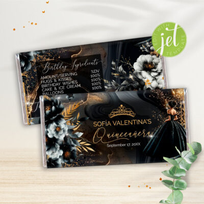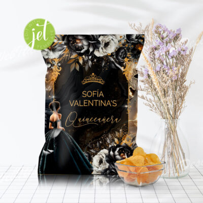- Black Gold Quinceañera Chip Bag Wrapper – stylish editable printable for Black Gold Quinceañera snacks and favors. Try Demo, Copy and Paste into browser. https://jettemplate.com/demo/TF1470 This is a Digital Item that you'll be able to access and EDIT yourself through a link sent to your email.