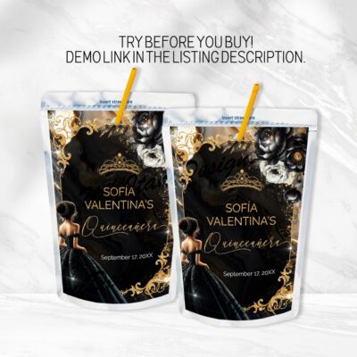 - Black Gold Quinceañera Juice Labels – elegant printable wrappers for party drinks. Perfect for a Black Gold Quinceañera theme. Instant download, easy to use. Try Demo, Copy and Paste into browser. https://jettemplate.com/demo/QJ7347 This is a Digital Item that you'll be able to access and EDIT yourself through a link sent…