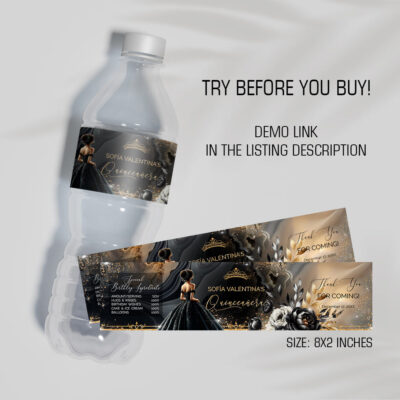 - Black Gold Quinceañera Water Bottle Labels – printable template for personalized drinks at your glamorous 15th birthday. Try Demo, Copy and Paste into browser. https://jettemplate.com/demo/PQ2604 This is a Digital Item that you'll be able to access and EDIT yourself through a link sent to your email.
