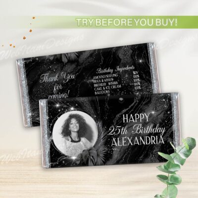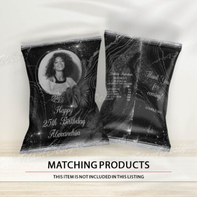 Personalized Birthday Chip bag template for Black Silver Party
