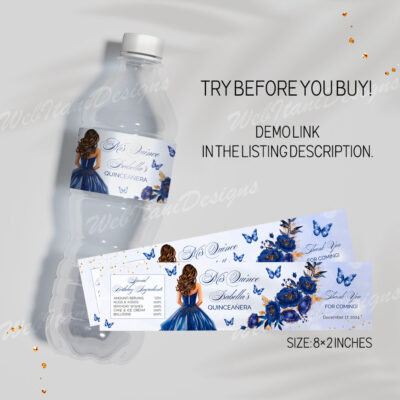 - Blue Quinceañera Water Bottle Labels will add an elegant Cinderella touch to your Sweet 15 celebration. These printable labels are easy to use and perfect for decorating drinks at your quinceañera. Try Demo, Copy and Paste into browser. https://jettemplate.com/demo/MX6463 This is a Digital Item that you'll be able to access…