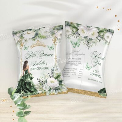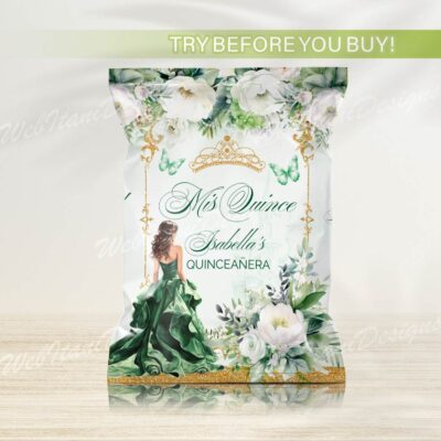 - Green Gold Quinceanera Chip Bag with flowers and a gold crown is perfect for Sweet 16 birthday or Mis Quince Anos Birthday! Try Demo, Copy and Paste into browser. https://jettemplate.com/demo/JX7154 This is a Digital Item that you'll be able to access and EDIT yourself through a link sent to your…
