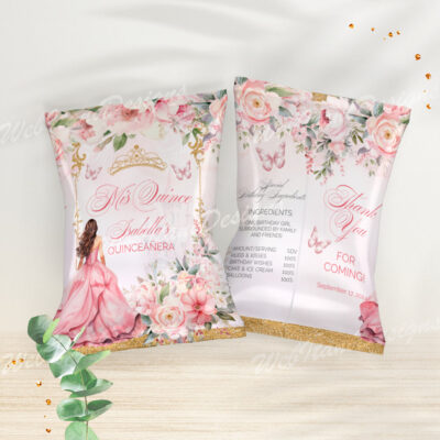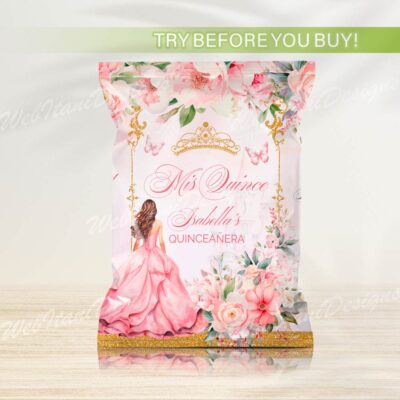 - Editable Pink and Gold Quinceanera Chip Bag with flowers and a gold crown is perfect for Sweet 16 birthday or Mis Quince Anos Birthday! Try Demo, Copy and Paste into browser. https://jettemplate.com/demo/NR2288 This is a Digital Item that you'll be able to access and EDIT yourself through a link sent…