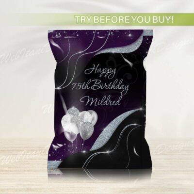 - Purple Silver Chip Bag Wrapper adds sparkle and style to your snack table! Designed with vibrant balloons and silver glitter effects, this editable wrapper is perfect for girl birthday or quince parties. Try Demo, Copy and Paste into browser. https://jettemplate.com/demo/SY9879 This is a Digital Item that you’ll be able to…