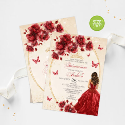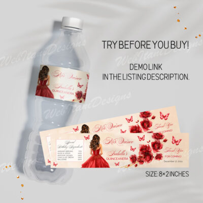 - Red Gold Quinceanera Water Bottle Labels with flowers, butterflies, and a gold crown is perfect for a Sweet 16 or Mis Quince Años celebration. Try Demo, Copy and Paste into browser. https://jettemplate.com/demo/DW9281 This is a Digital Item that you'll be able to access and EDIT yourself through a link sent…