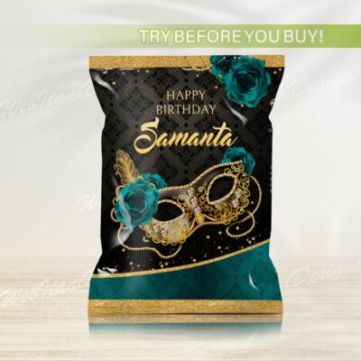 - Teal Gold Masquerade Ball chip bags with Masquerade Mask are perfect for any occasion or event! Add your own words! Make your favors one of a kind of ANY event Try Demo, Copy and Paste into browser. www.jettemplate.com/demo/EZ3418 This is a Digital Item that you’ll be able to access and…