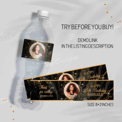 - Celebrate in style with this elegant, customizable black and gold birthday water bottle label template! Easily add a personal touch by including your photo, making your party favors extra special and memorable. Try Demo, Copy and Paste into browser. https://jettemplate.com/demo/HG6090 This is a Digital Item that you'll be able to…