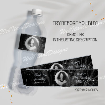 - Black Silver Water Bottle Labels are size 8"x2". Easily add a personal touch by including your photo, making your party favors extra special and memorable. Make your favors one of a kind of ANY event! Try Demo, Copy and Paste into browser. https://jettemplate.com/demo/ZO5904 This is a Digital Item that you'll…