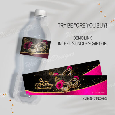 - Fuchsia Pink Masquerade water bottle labelss with Masquerade Mask and Roses are perfect for Birthday Party, Christmas! Editable Burgundy Masquerade Water Bottle Labels are size 8"x2". Try Demo, Copy and Paste into browser. https://jettemplate.com/demo/ON3343 This is a Digital Item that you'll be able to access and EDIT yourself through a…
