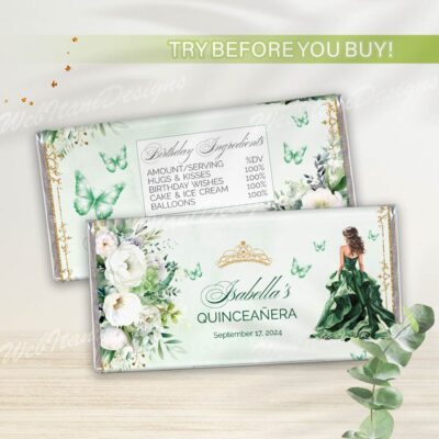 - Green Gold Quinceanera water bottle labels with flowers, butterflies, and a gold crown is perfect for a Sweet 16 or Mis Quince Años celebration. Try Demo, Copy and Paste into browser. https://jettemplate.com/demo/TF4118 This is a Digital Item that you'll be able to access and EDIT yourself through a link sent…