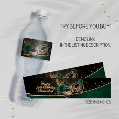 - Green Gold Masquerade water bottle labels are size 8"x2". Green Gold Masquerade Ball Bottle Labels with Masquerade Mask and Roses are perfect for Birthday Party, Christmas! Add your own words! Try Demo, Copy and Paste into browser. https://jettemplate.com/demo/DI5608 This is a Digital Item that you’ll be able to access and…