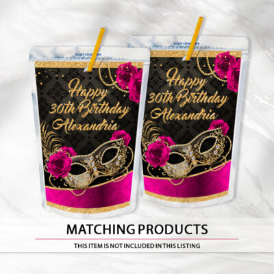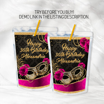 - Fuchsia Pink Masquerade Juice Bag Pouch Label, ideal for a Quinceanera, Birthday party, Graduation party. Try Demo, Copy and Paste into browser. https://jettemplate.com/demo/WC4997 This is a Digital Item that you'll be able to access and EDIT yourself through a link sent to your email.