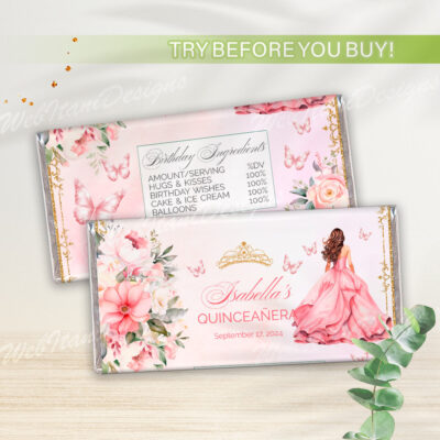 - Pink Quinceañera water bottle labels with flowers, butterflies, and a gold crown is perfect for a Sweet 16 or Mis Quince Años celebration. Try Demo, Copy and Paste into browser. https://jettemplate.com/demo/NI3230 This is a Digital Item that you'll be able to access and EDIT yourself through a link sent to…