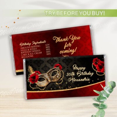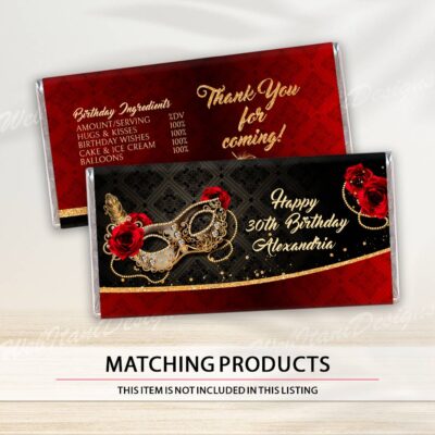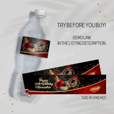 - Red Gold Water Bottle Label for Masquerade party are size 8"x2". Red Gold Masquerade Ball Bottle Labels with Masquerade Mask and Roses are perfect for Birthday Party, Christmas! Add your own words! Make your favors one of a kind of ANY event! Try Demo, Copy and Paste into browser. https://jettemplate.com/demo/PQ7735…