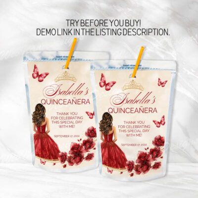 - Red Gold Quinceanera Juice Pouch Labels with flowers, butterflies, and a gold crown is perfect for a Sweet 16 or Mis Quince Años celebration. Try Demo, Copy and Paste into browser. https://jettemplate.com/demo/OV9780 This is a Digital Item that you'll be able to access and EDIT yourself through a link sent…