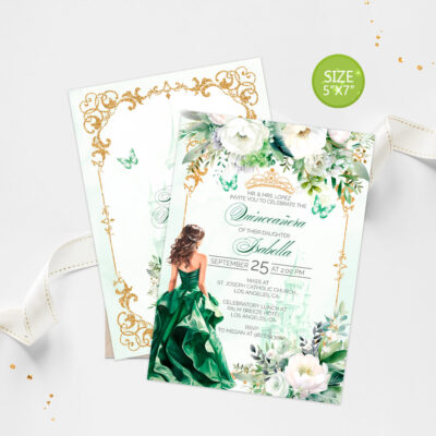 - Emerald Green Quinceañera invitation with flowers and a gold crown is perfect for your party. Try Demo, Copy and Paste into browser. https://jettemplate.com/demo/BQ9073 This is a Digital Item that you'll be able to access and EDIT yourself through a link sent to your email.